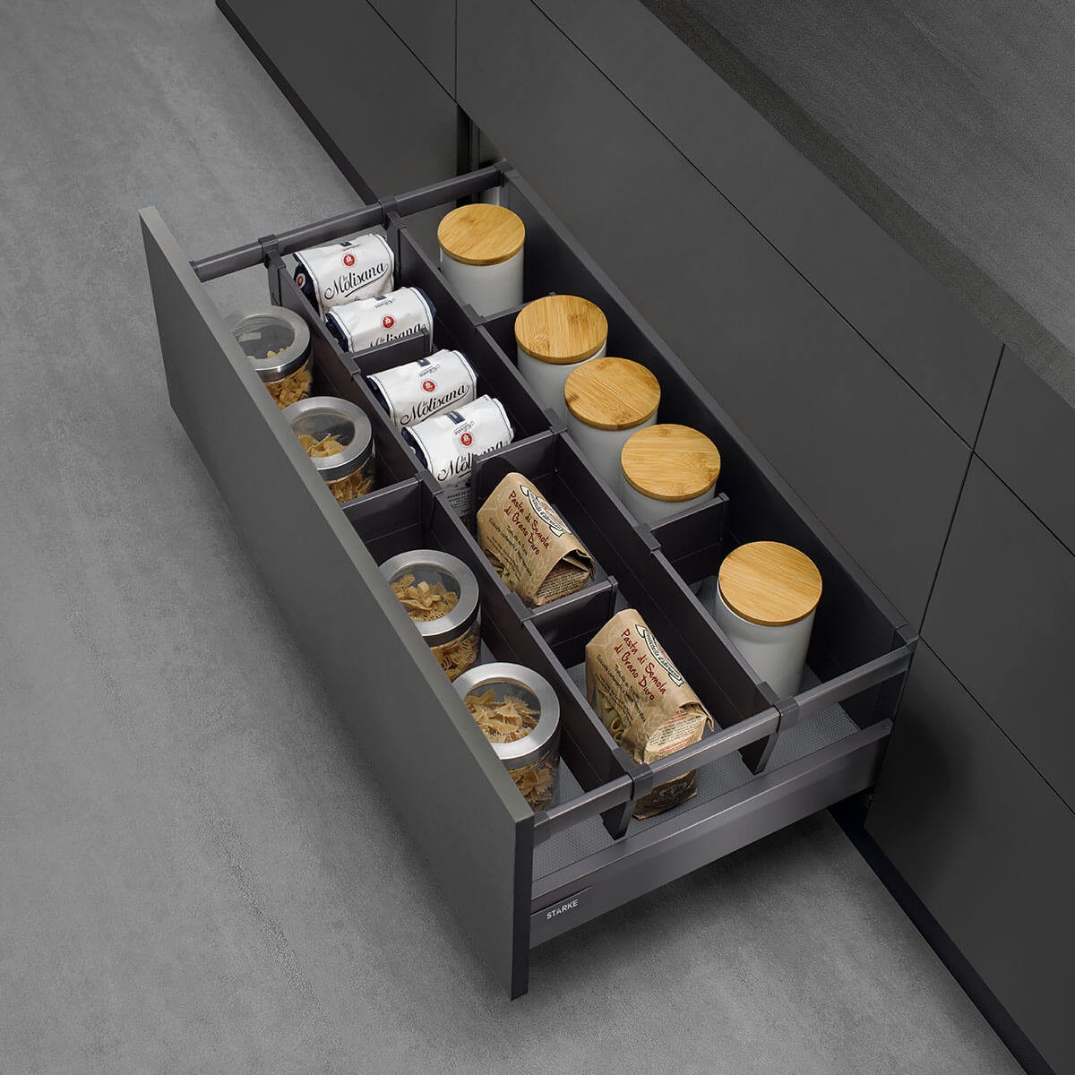Slim and sleek modern design that ensures a rust-free and stylish storage solution infused with a touch of sophistication. The Starke drawer box system offers a choice of two colors, seamlessly blending with a variety of design styles, thus elevating the overall kitchen experience.