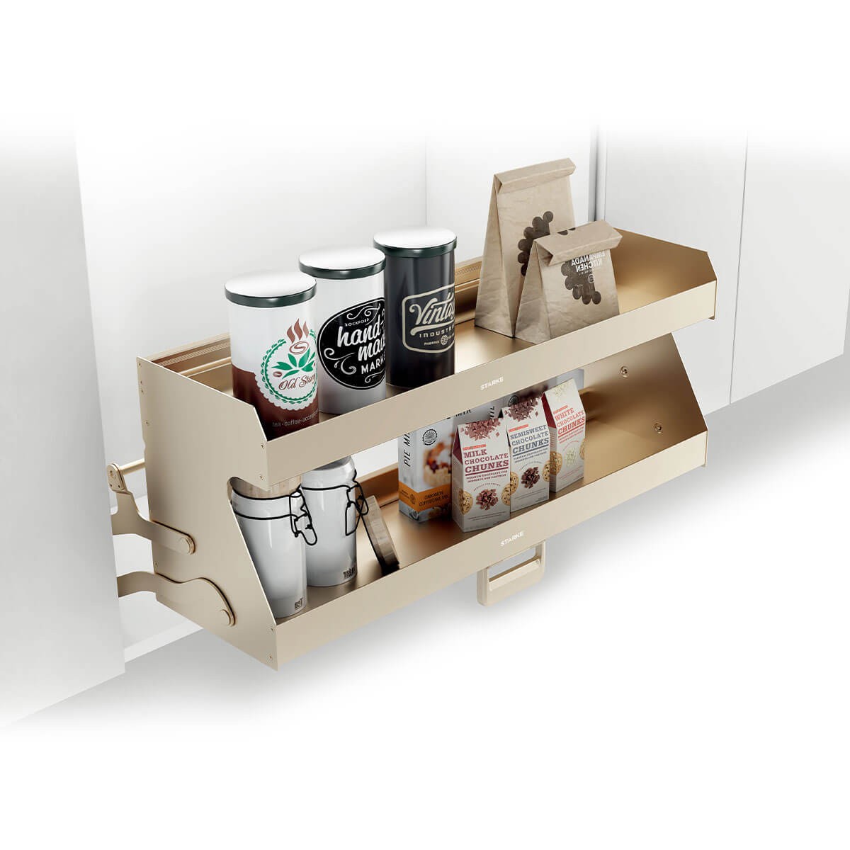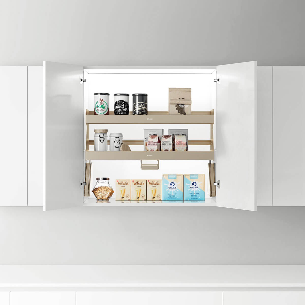 Pull out basket for base cabinet with proper space partition design to store various dry ingredients.