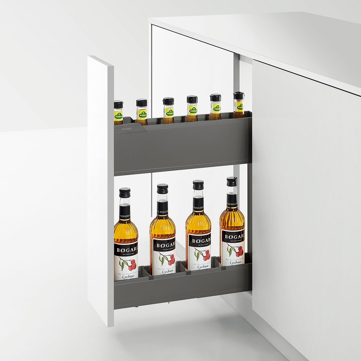 Pull out basket for base cabinet with proper space partition design to store various cruets, condiments, oil bottles.