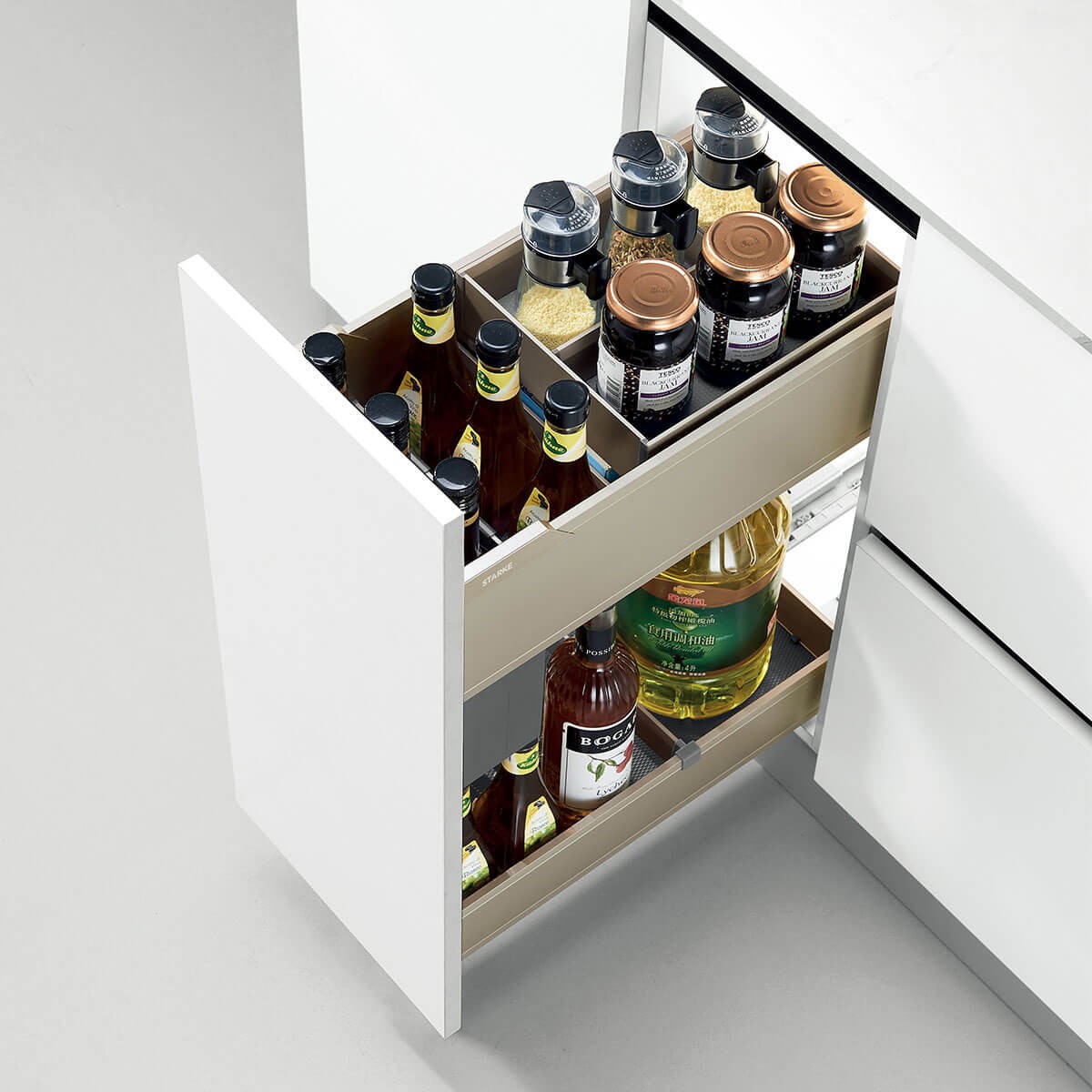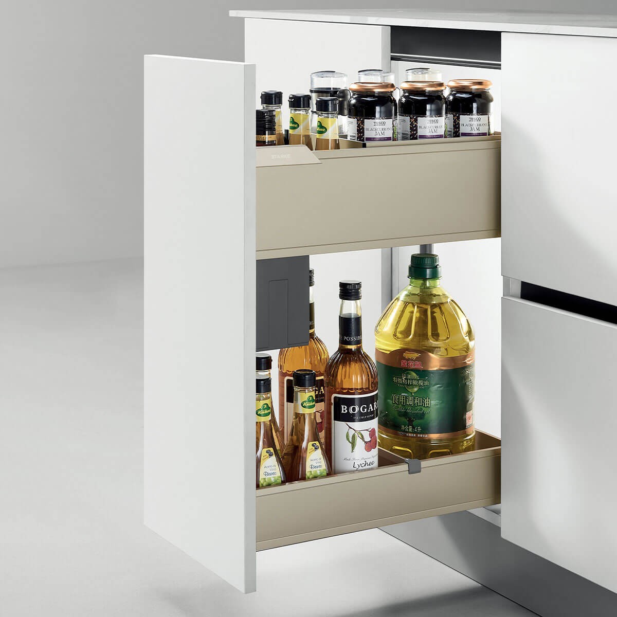 Pull out basket for base cabinet with proper space partition design to store various cruets, condiments, oil bottles.
