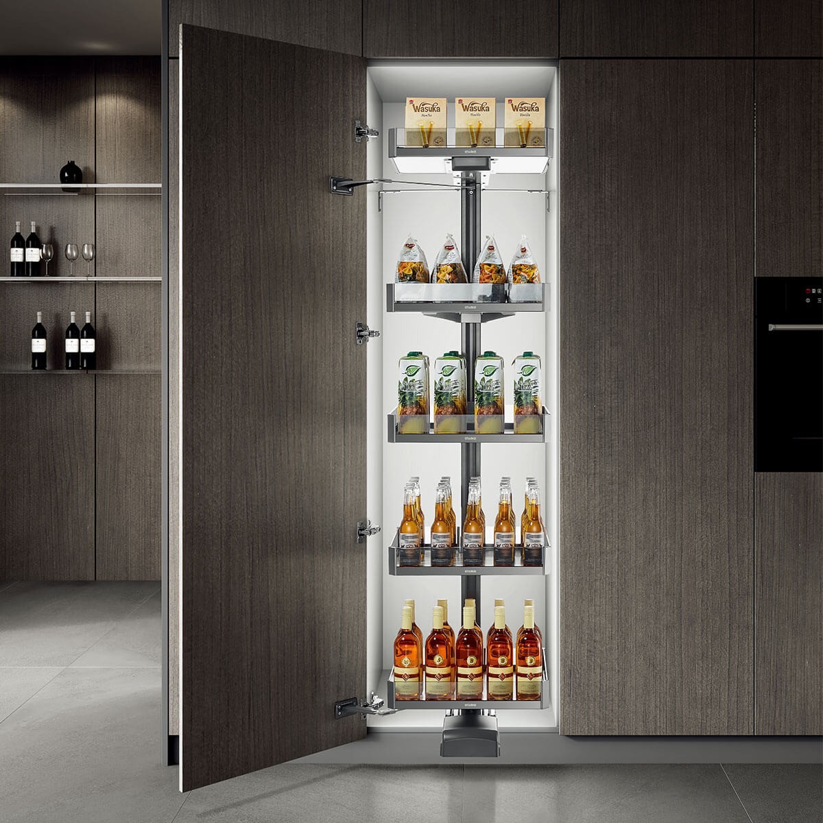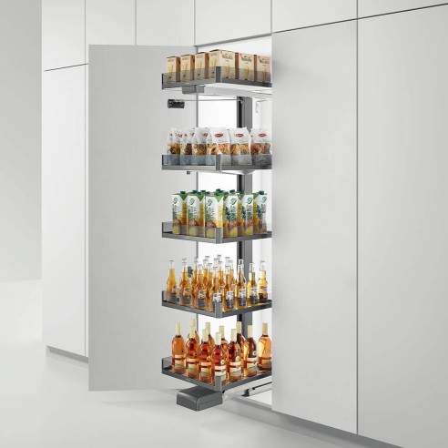 A complete pull-out Tall storage with super load-bearing damping, fully pull-out guide rail. Convenient to fetch items, suitable to used with embedded refrigerator in high cabinet.