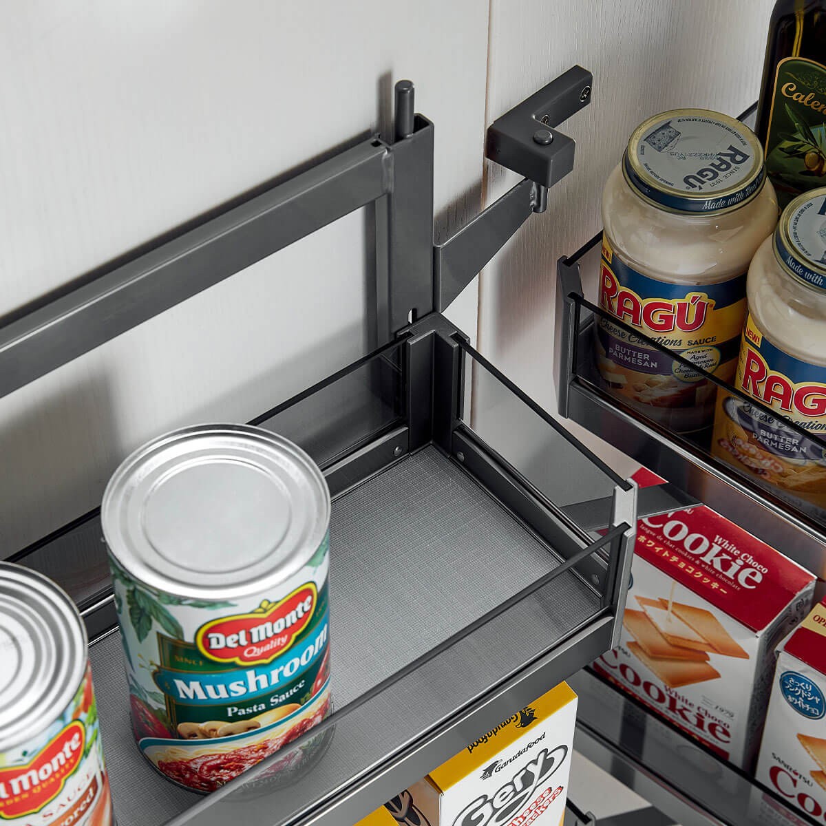Pull out basket for base cabinet with proper space partition design to store various cruets, condiments, oil bottles.