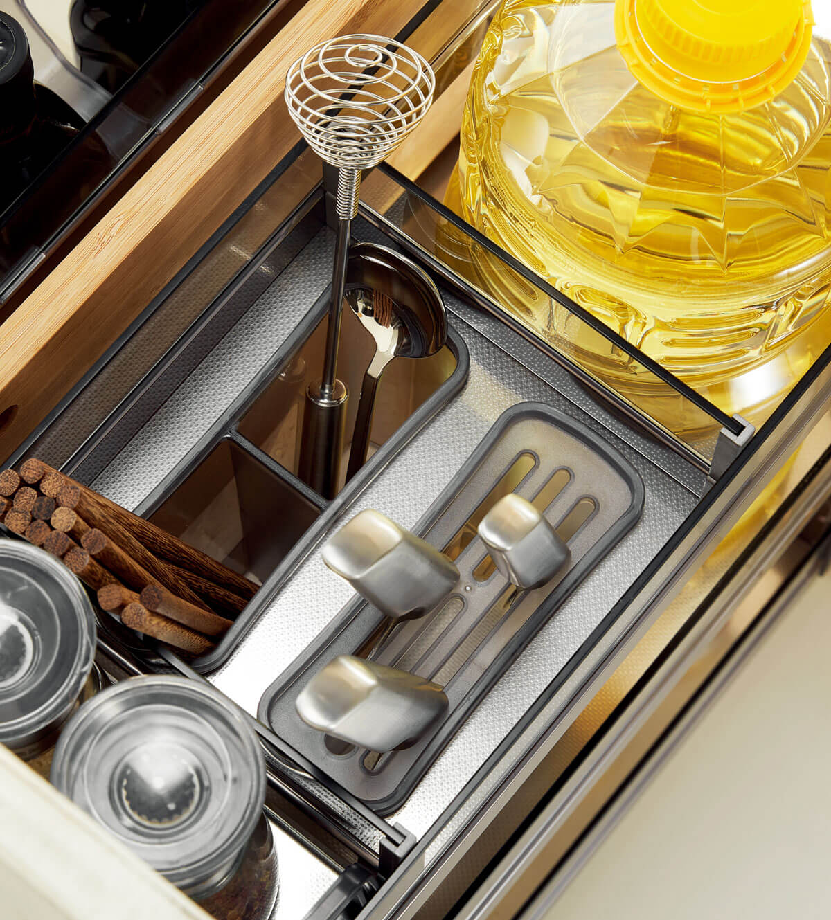 Pull out basket for base cabinet with proper space partition design to store various cruets, condiments, oil bottles.