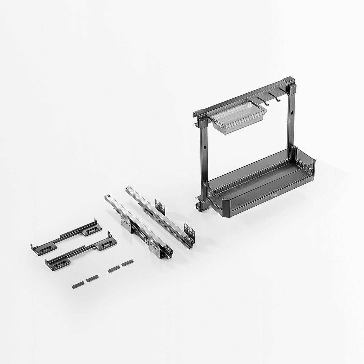 Pull out basket for base cabinet with proper space partition design to store various cruets, condiments, oil bottles.