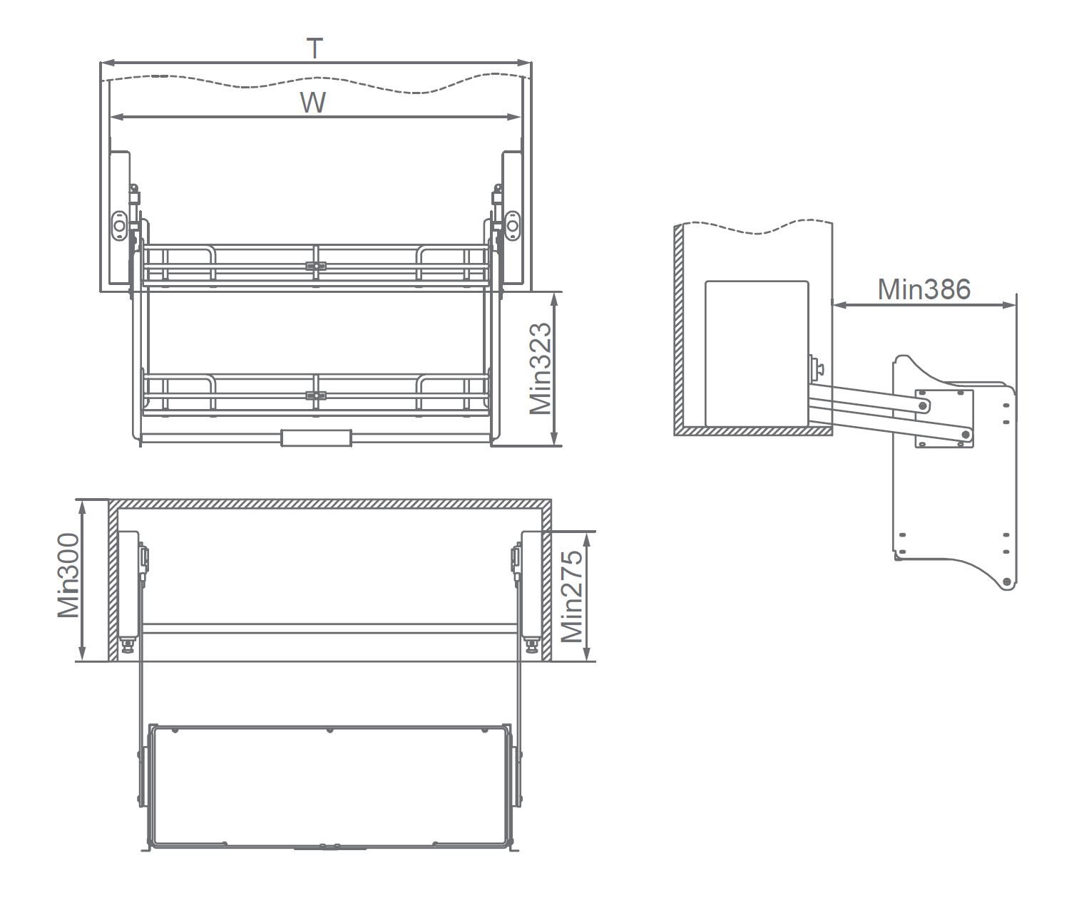 Free lift cupboard storage system. Allows users to fully utilize higher space of wall cupboard, providing convenience in fetching items.