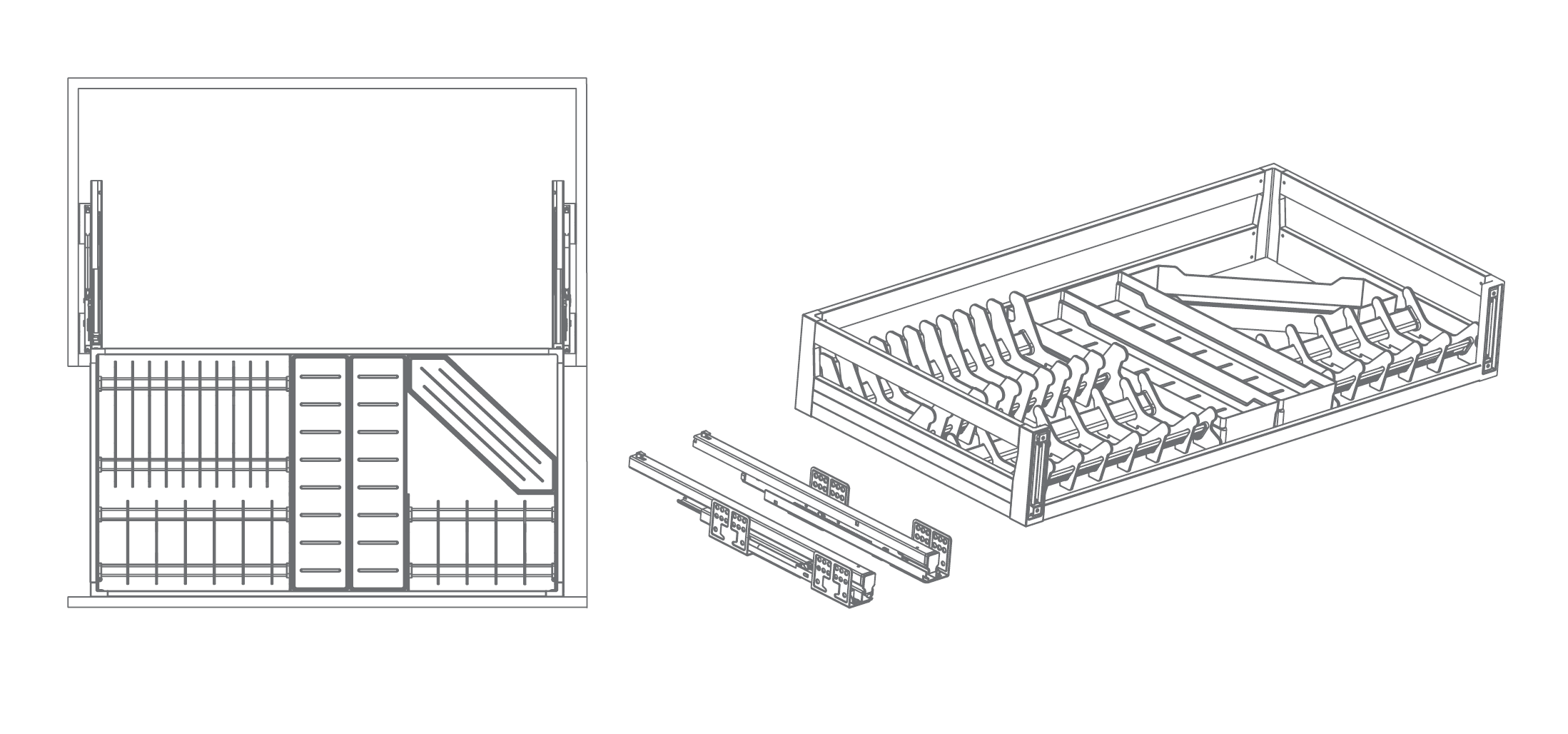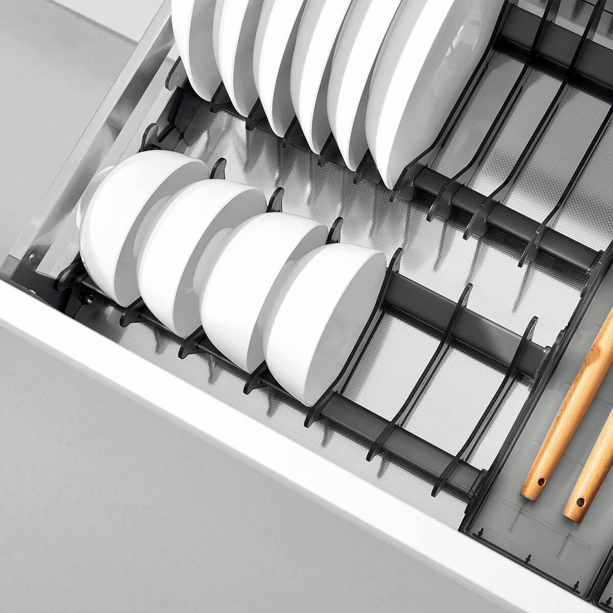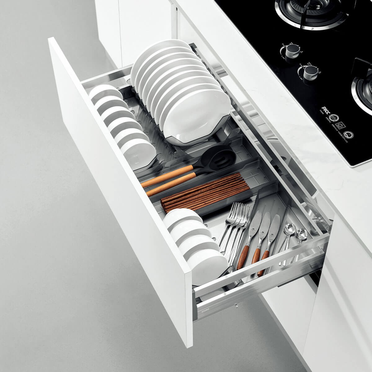 Pull out basket for base cabinet with proper space partition design to store various dishes, utensils and small pots.