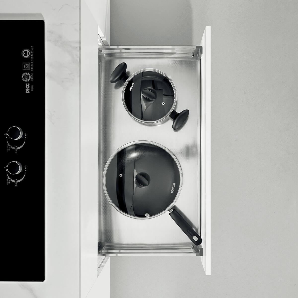 Pull out basket for base cabinet to store various dishes, utensils and small pots.